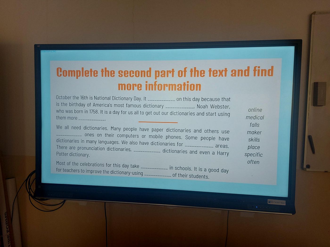 V októbri si ôsmaci pripomenuli Medzinárodný deň slovníkov. Povedali sme si, čo slovník vlastne je, na čo slúži a aké druhy slovníkov poznáme. Žiaci pracovali so slovíčkami, textom a dokonca mali odhaliť aj mystery slovíčka ukryté za nápovedami.