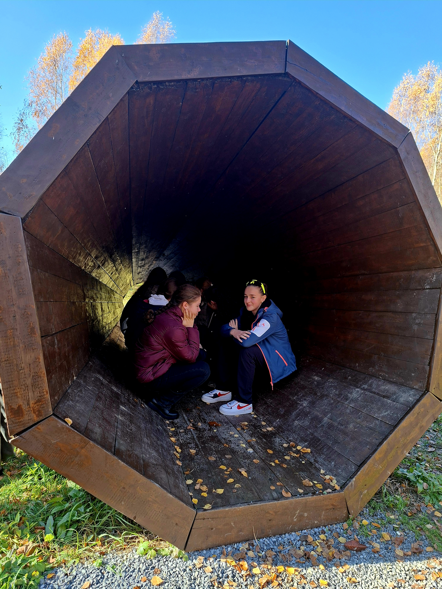 Našou prvou zastávkou bol drevený megafón Hlas lesa, neďaleko obce Zlatá Baňa. Hlas lesa slúži ako zosilňovač zvukov prírody. Jeho tvar pripomína deväťhranný ihlan.