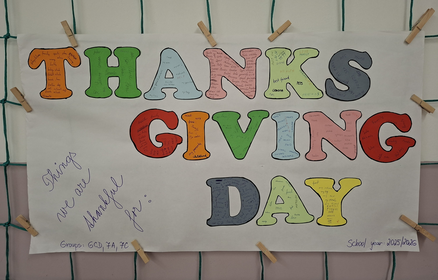 So žiakmi 6CD, 7A a 7C bola zrealizovaná tematická hodina THANKSGIVING DAY . Žiaci sa dozvedeli o čom tento americký sviatok je, zahrali si Thanksgiving bingo a v skupinách vytvorili plagát zo sloveného spojenia THANKSGIVING DAY, do ktorého vpisovali za čo sú vo svojom živote vďační.