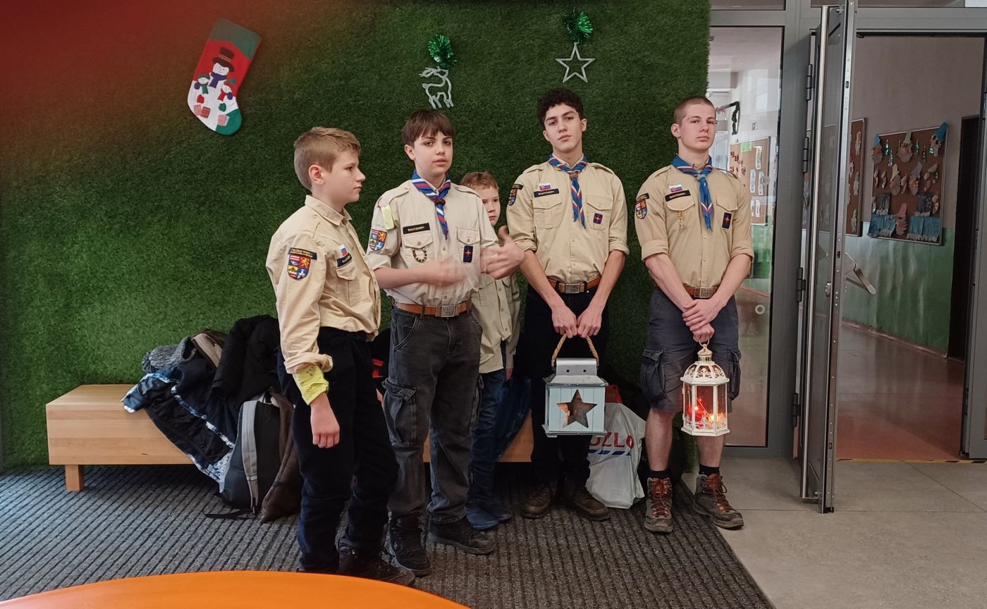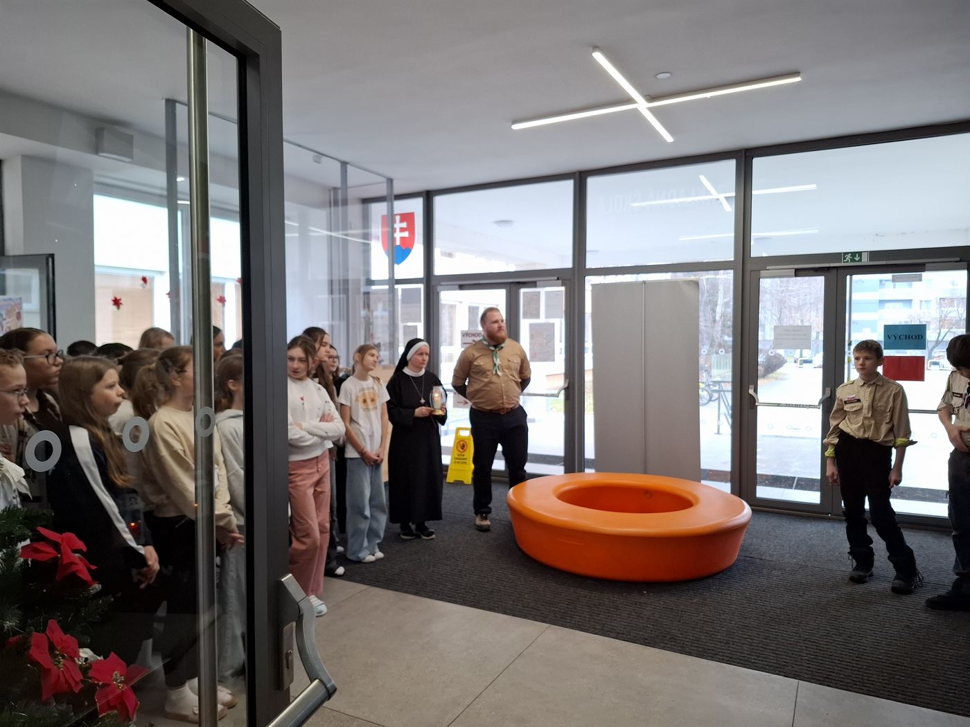 Posolstvo pokoja, lásky, mieru a jednoty nesie Betlehemské svetlo do miest a dedín celého sveta. Na Slovensko ho prinášajú a na jednotlivé miesta roznášajú skauti. Skupina skautov - chlapcov z Federácie skautov Európy so svojím vedúcim o. Kamilom Ganóczym zavítala aj na našu školu. S prianím, aby sa svetlo nádeje a pokoja šírilo ďalej, sme si plamienok z Betlehema odpálili aj my. Na vrátnici školy bolo pripravené pre tých, ktorí si ho chceli odniesť aj do svojich domovov. Nech posolstvo malého plamienka zapáli dobro, radosť a pokoj v srdci každého človeka.