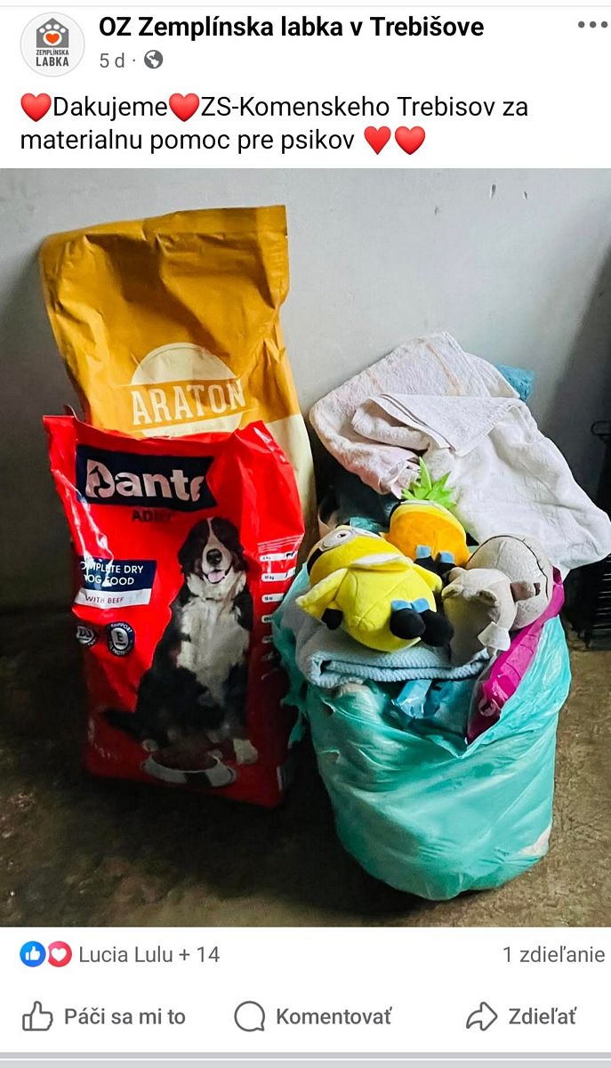 Každý dar má zmysel a pomáha zvieratkám, ktoré sú odkázané na našu pomoc. Všetky vyzbierané veci boli odovzdané útulkom OZ Zemplínska labka v Trebišove, OZ Pomoc psíkom na východnom Slovensku vo Veľkých Kapušanoch a tiež súkromnému azylu pre zvieratá Farma Happy vo Veľkých Kapušanoch. Osobitné poďakovanie patrí dievčatám zo špeciálneho podporného tímu, ktoré sa aktívne zapojili do tejto aktivity a pri odovzdávaní zbierky pomohli s venčením útulkáčov.