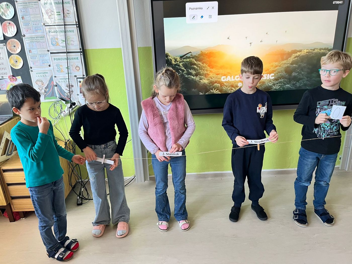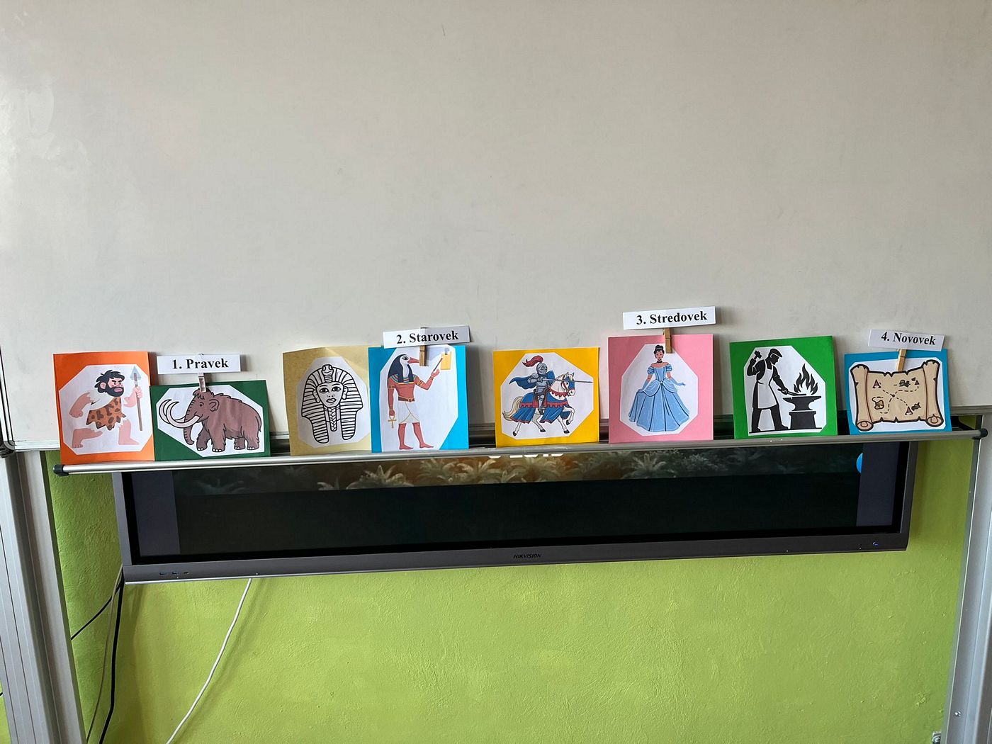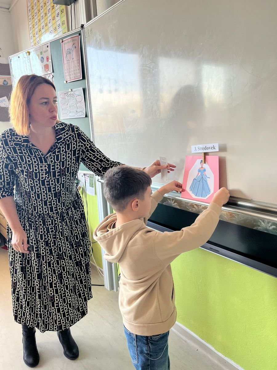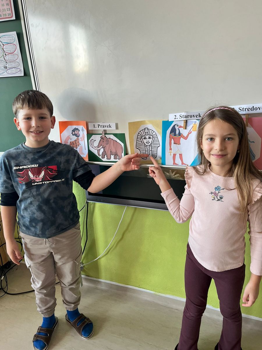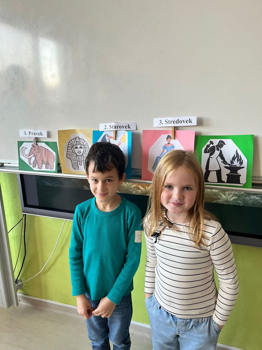 Najprv sme si vysvetlili, čo je to časová os. Vďaka nej sme zistili, čo bolo veľmi dávno (pravek a starovek), čo bolo dávno (stredovek) a čo je nedávno (novovek). Deti lúštili hádanky o pračloveku, faraónovi, rytierovi či kováčovi, tiež sme sa snažili postavy začleniť do jedného z období.