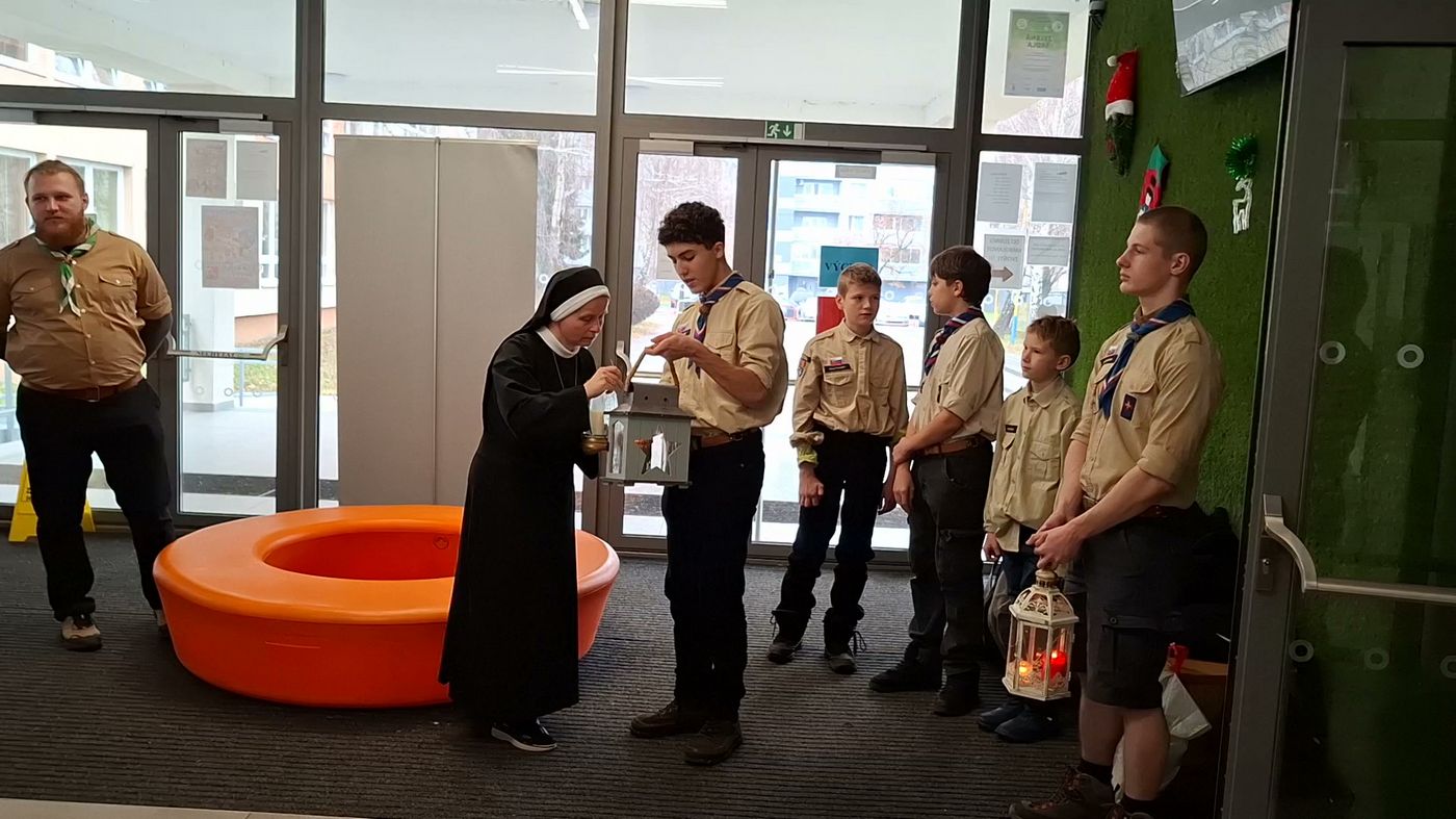 Posolstvo pokoja, lásky, mieru a jednoty nesie Betlehemské svetlo do miest a dedín celého sveta. Na Slovensko ho prinášajú a na jednotlivé miesta roznášajú skauti. Skupina skautov - chlapcov z Federácie skautov Európy so svojím vedúcim o. Kamilom Ganóczym zavítala aj na našu školu. S prianím, aby sa svetlo nádeje a pokoja šírilo ďalej, sme si plamienok z Betlehema odpálili aj my. Na vrátnici školy bolo pripravené pre tých, ktorí si ho chceli odniesť aj do svojich domovov. Nech posolstvo malého plamienka zapáli dobro, radosť a pokoj v srdci každého človeka.